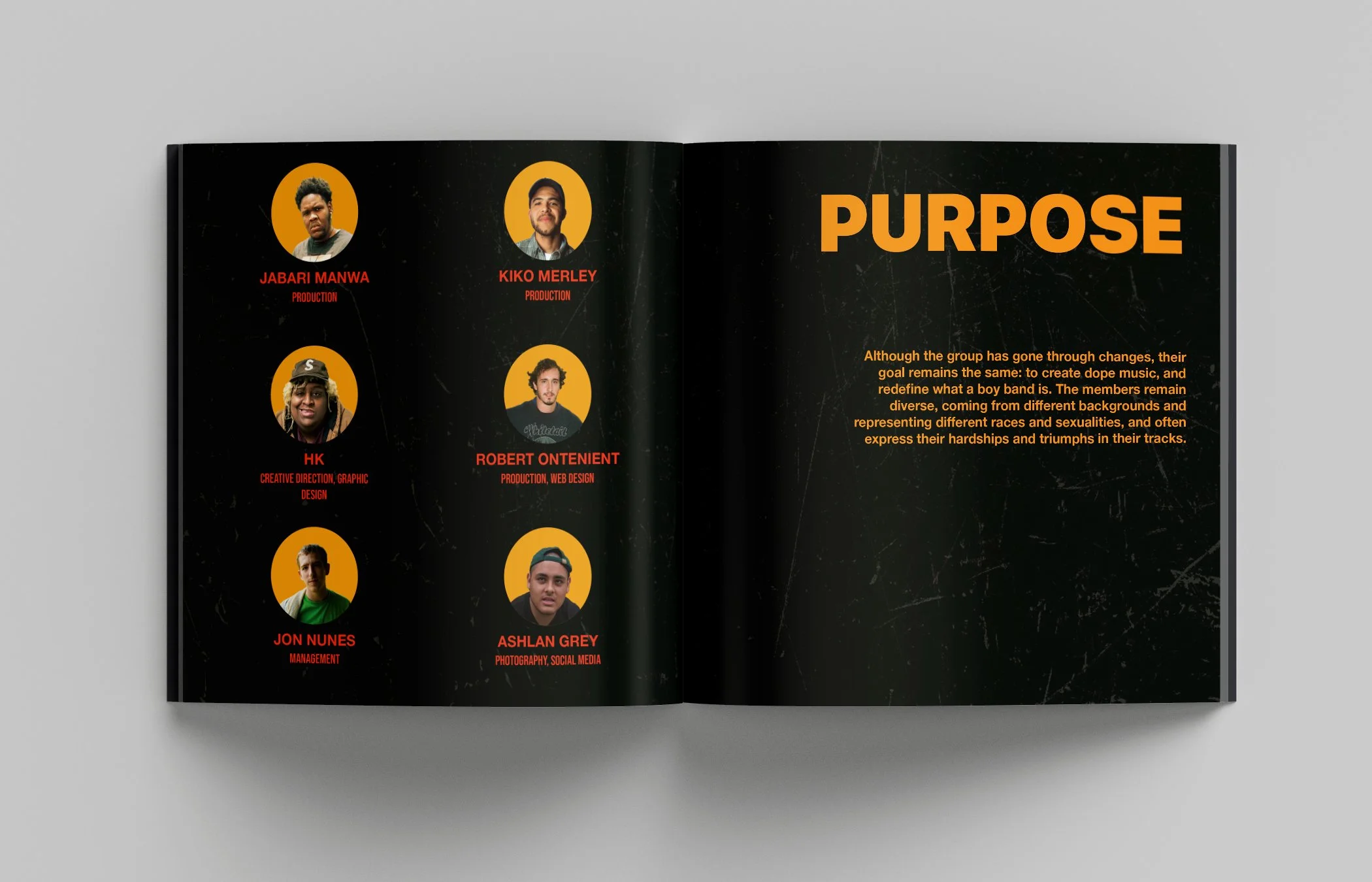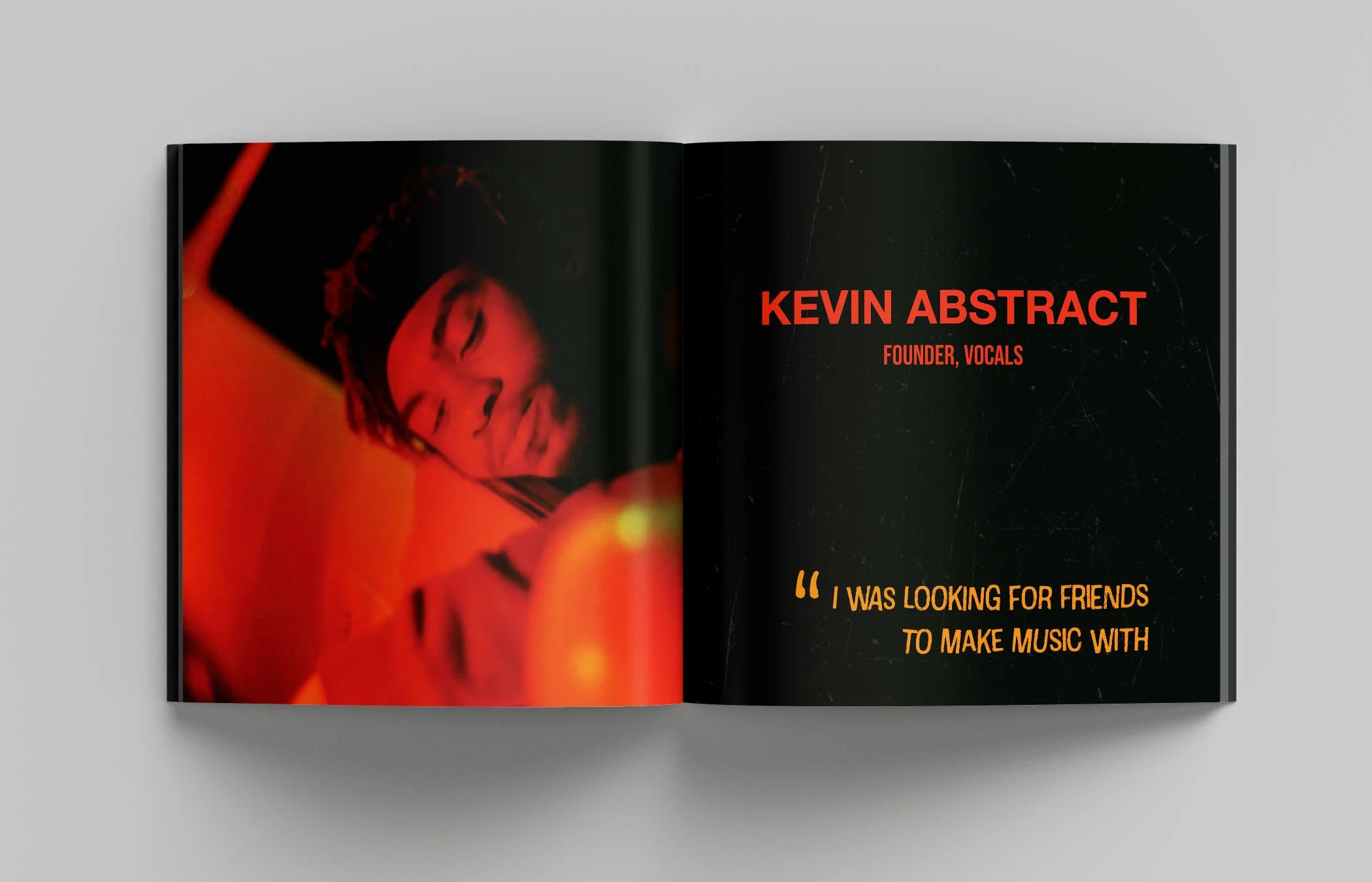 In creating an artist book for my favorite pop-rap band, Brockhampton, I wanted to showcase not only their albums and aesthetics through the years, but the connection they share as a band. They have thirteen members including their own in house producers, graphic designer, and photographer, who they regard as just as important as the vocalists. In order to communicate the bond they share, I decided to highlight the band’s founder, Kevin Abstract. By using quotes from Kevin about the formation and future end of the group, I was able to demonstrate the bond the members show while still providing information on the individuals and their different albums.