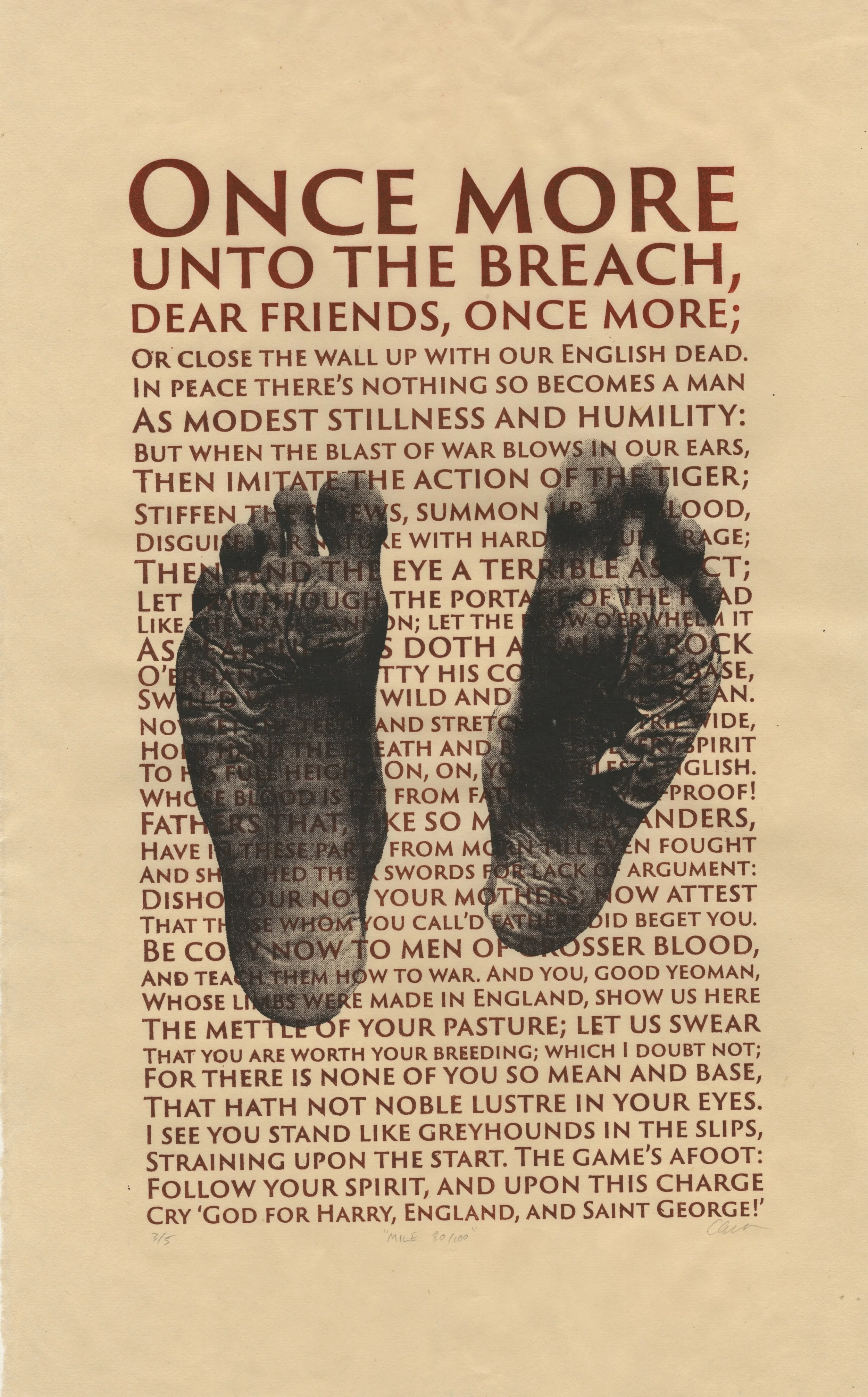 My brother runs 100 mile races. These physical challenges make him feel like his own Greek hero, but at 20 hours in, often the only thing to keep him going is our dad. He has Shakespeare memorized, and recites this monologue from Henry VIII when my brother needs that extra push. I wanted to commend both of them for their work out on these races by combining the speech with a photolithograph of my brother’s feet after the race, which are peeling and bloodied.
