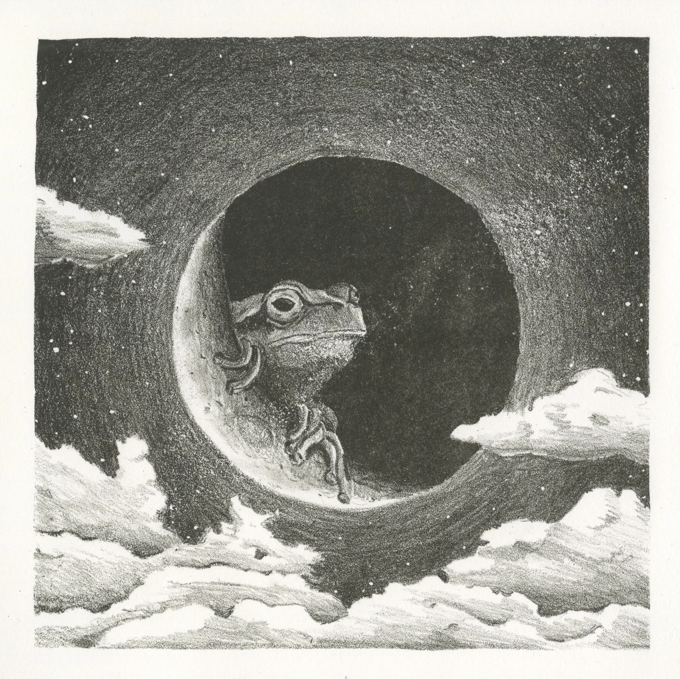 I’ve always held the moon in high regards and dreamt of it hiding a mysterious secret. A frog, however, is whimsical and fun, and the idea that one lives in the moon made me smile. I brought these two together in a playful illustration I drew on a litho stone.