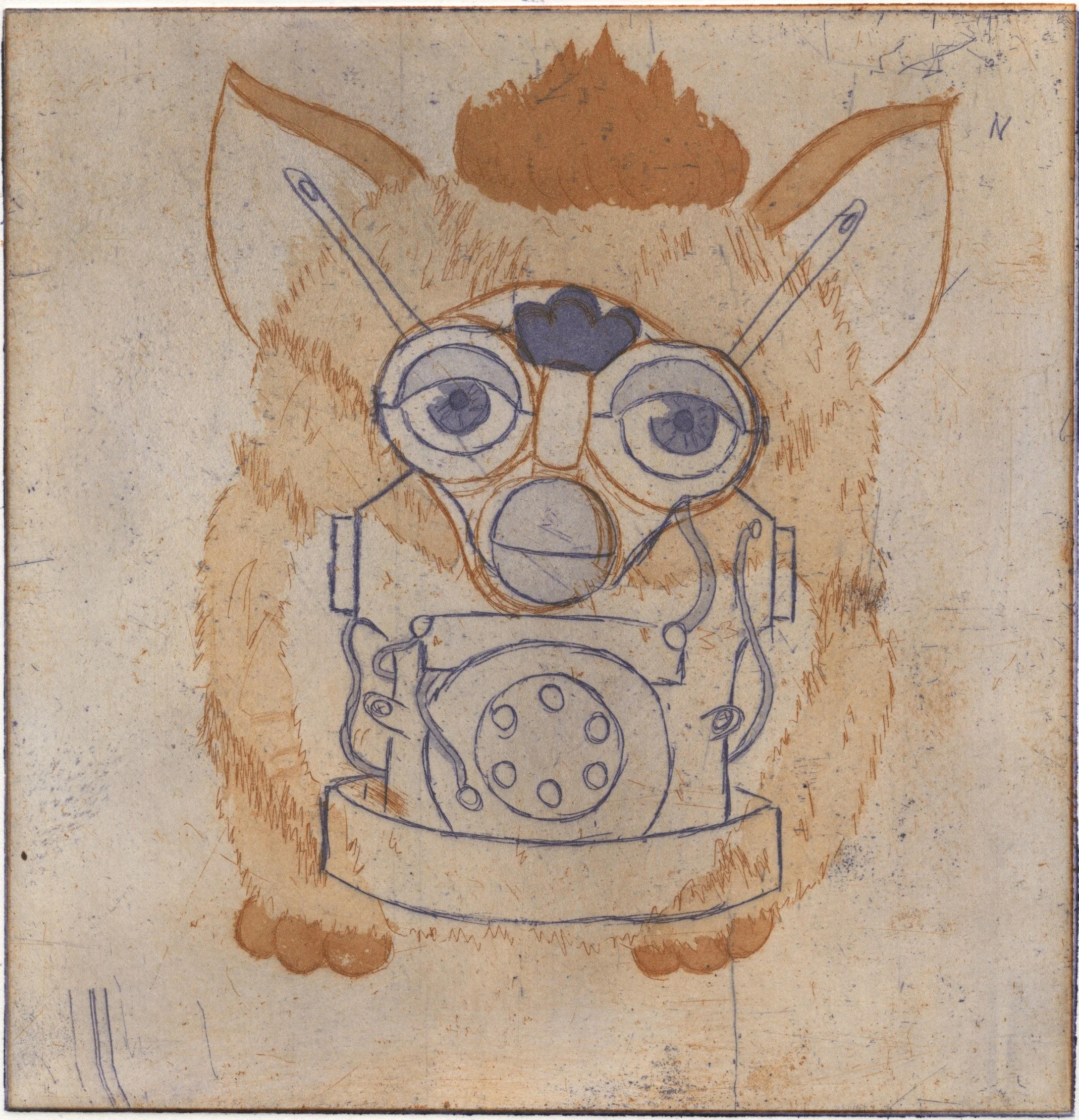 I’ve aways found nostalgia items from the 80’s and 90’s to be captivating, as they were just before my childhood. Furbies in particular are an icon of those decades that amuse me for their uncanny faux consciousness. Out of curiosity, I bought an old Furby and took it apart to learn how it worked. Seeing the difference between the skeleton and the fuzzy exterior was shocking, and I wanted to capture the dichotomy in a two plate etching.