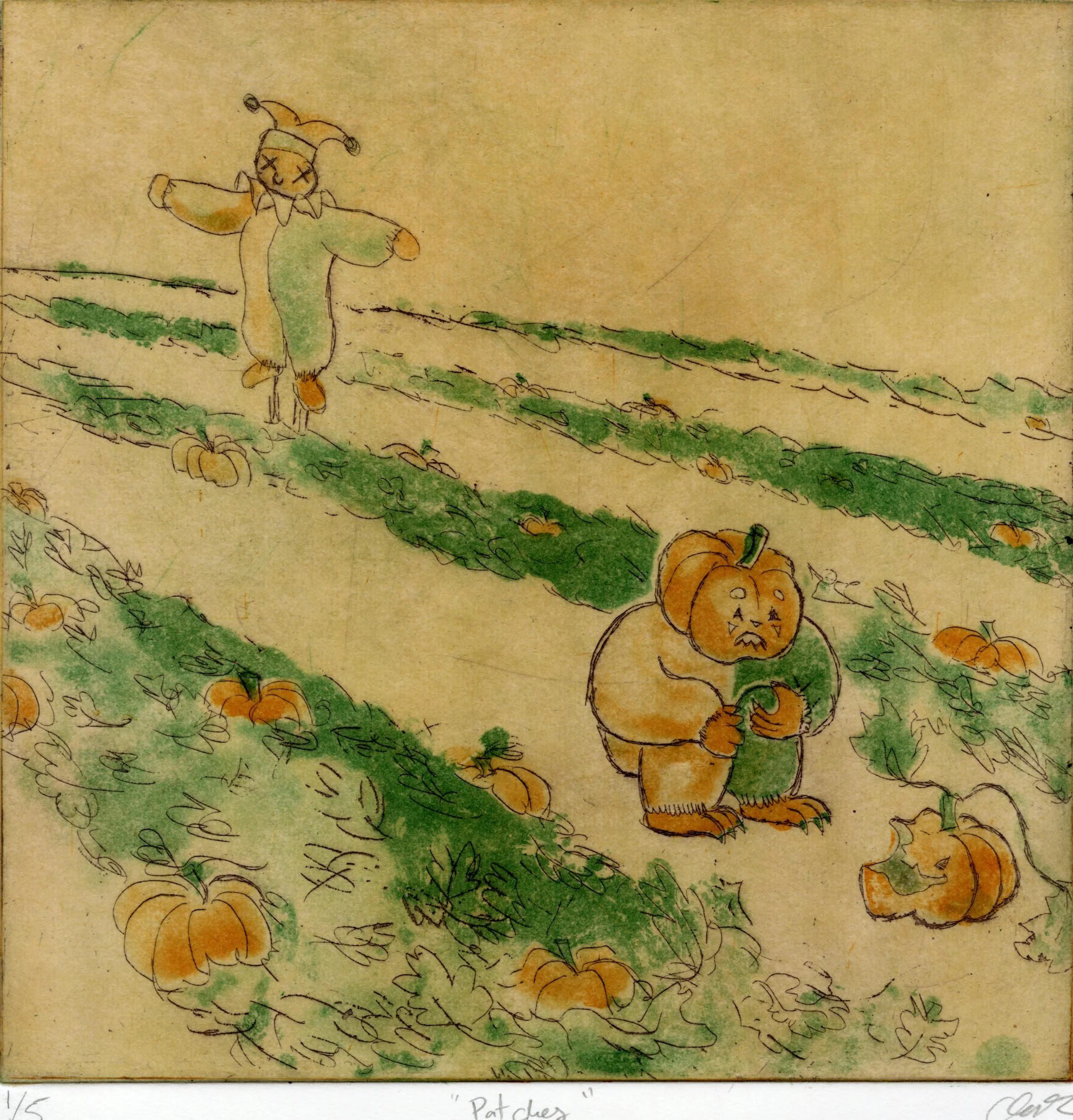 Still new to the world, Patches stopped to examine a rotted jack o’ lantern, concerned that it could’ve been his fate, or maybe a friend in another life. Despite fretting over the pumpkin, he leaves a scarecrow in the background unobserved, seemingly unaware that such a gruesome fate as being crucified is even a possibility. Fears of what lie beyond death haunt him, despite the fact that he has so much life left to live.